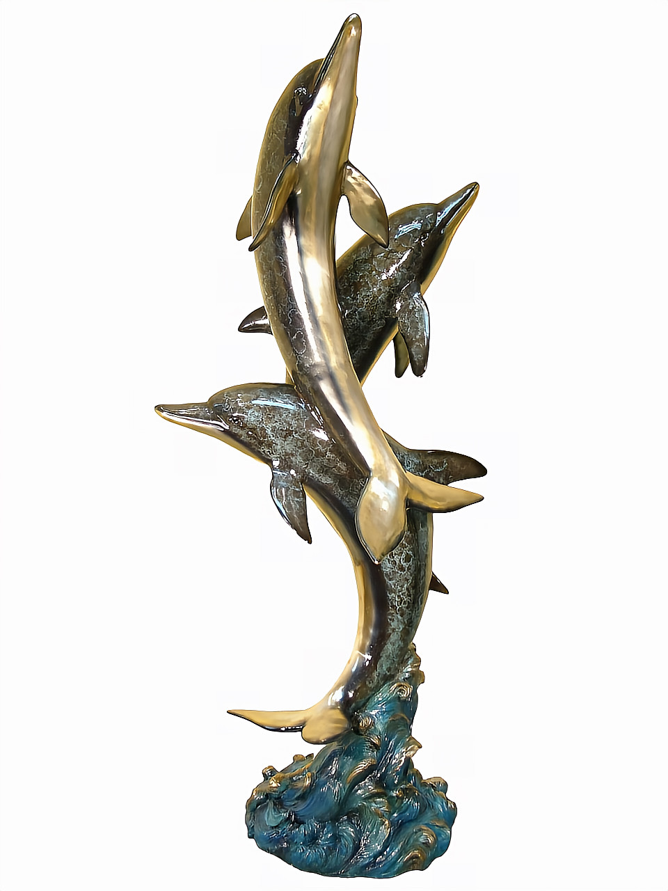 - Spectacularly rendered set of bronze dolphins, swimming upright